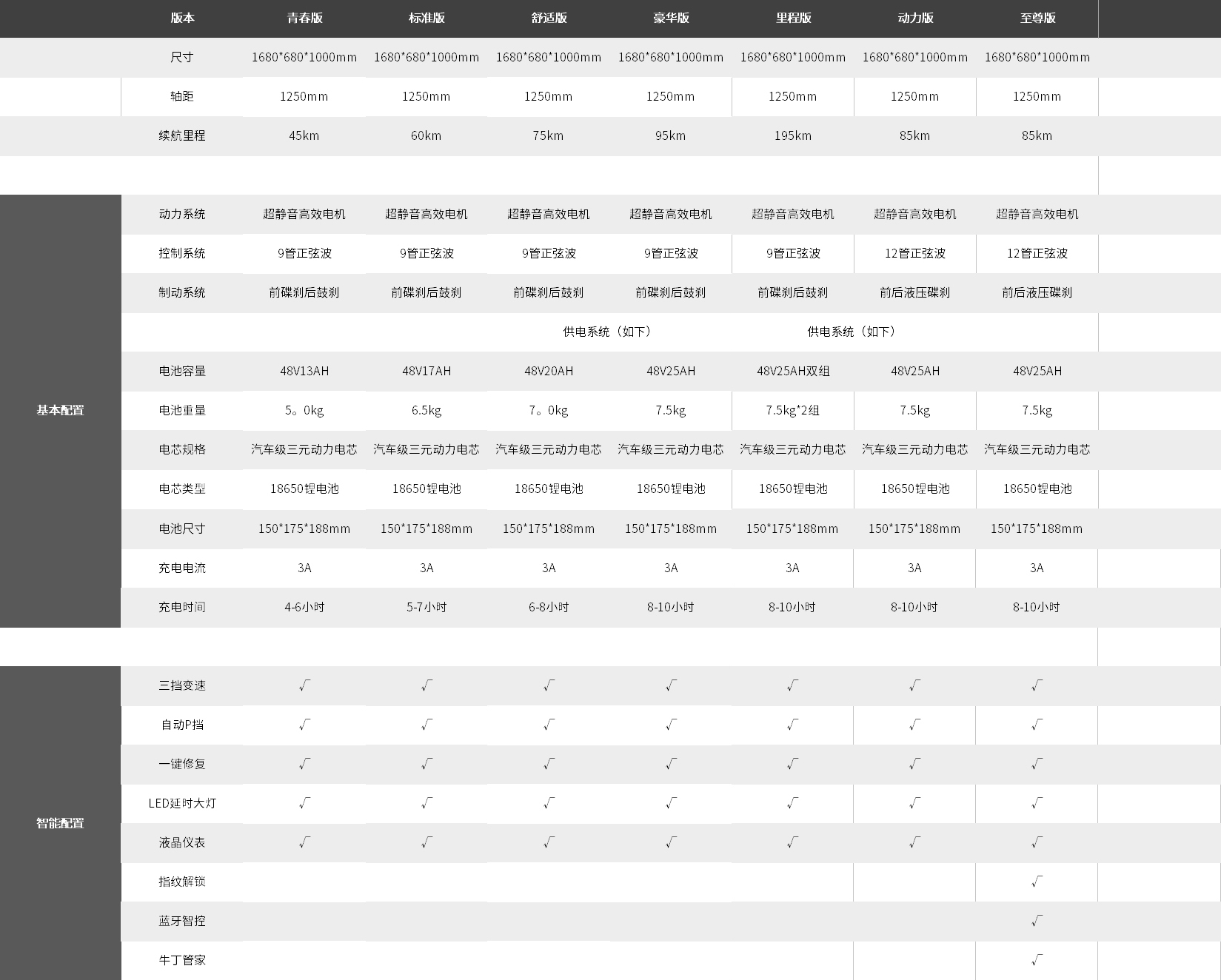 5年备注:续航里程与载重、气温、速度、路况、风速等因素紧密相关。此处所述续航里程远至196KG为双组里程版,指车辆在承重65kg,气温25℃,时速25km/h时,在无风的平坦路面均速连续行驶的里程,仅供参考。最终续航里程以实际为准。